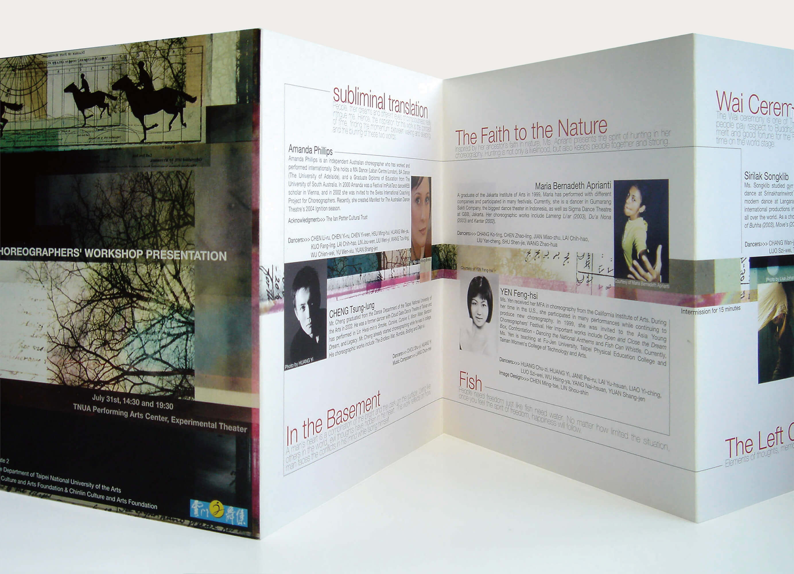 雲門舞集 此作品是雲門舞集針對年輕編舞者所舉辦的"尋找千里馬"活動,藉此找尋優秀編舞家並提供可揮灑 的舞台,在此作品裡使用手感效果呈現出較為藝術的視覺調性,另外以複雜的樹枝交錯同時帶有不同 的彩度背景,隱喻年輕人的未來充滿挑戰性,同時也有令人期待的繽紛色彩。