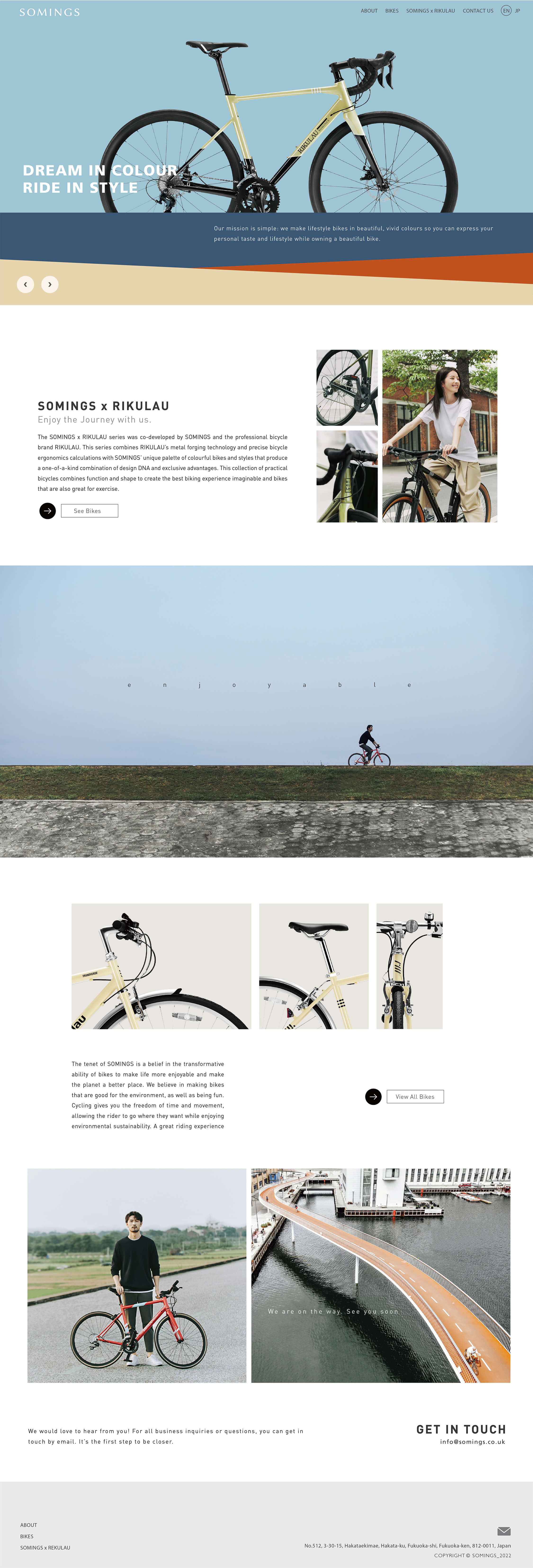 SOMINGS 總部位於日本福岡的SOMINGS,是以重視綠能環保與強調生活風格為主的自行車品牌,我執行此 品牌整體設計以及車體色彩規劃,並負責與專業自行車品牌Rikulau合作系列車款的車體設計,同時 擔任SOMINGS的品牌視覺顧問,負責品牌的視覺控制。