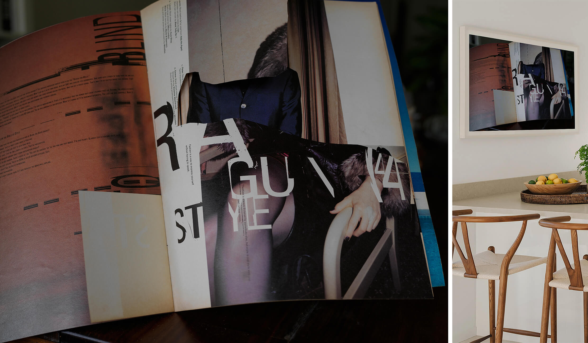 A lush tree stands alongside a minimalist building, while original imagery, geometric forms, and solid color blocks